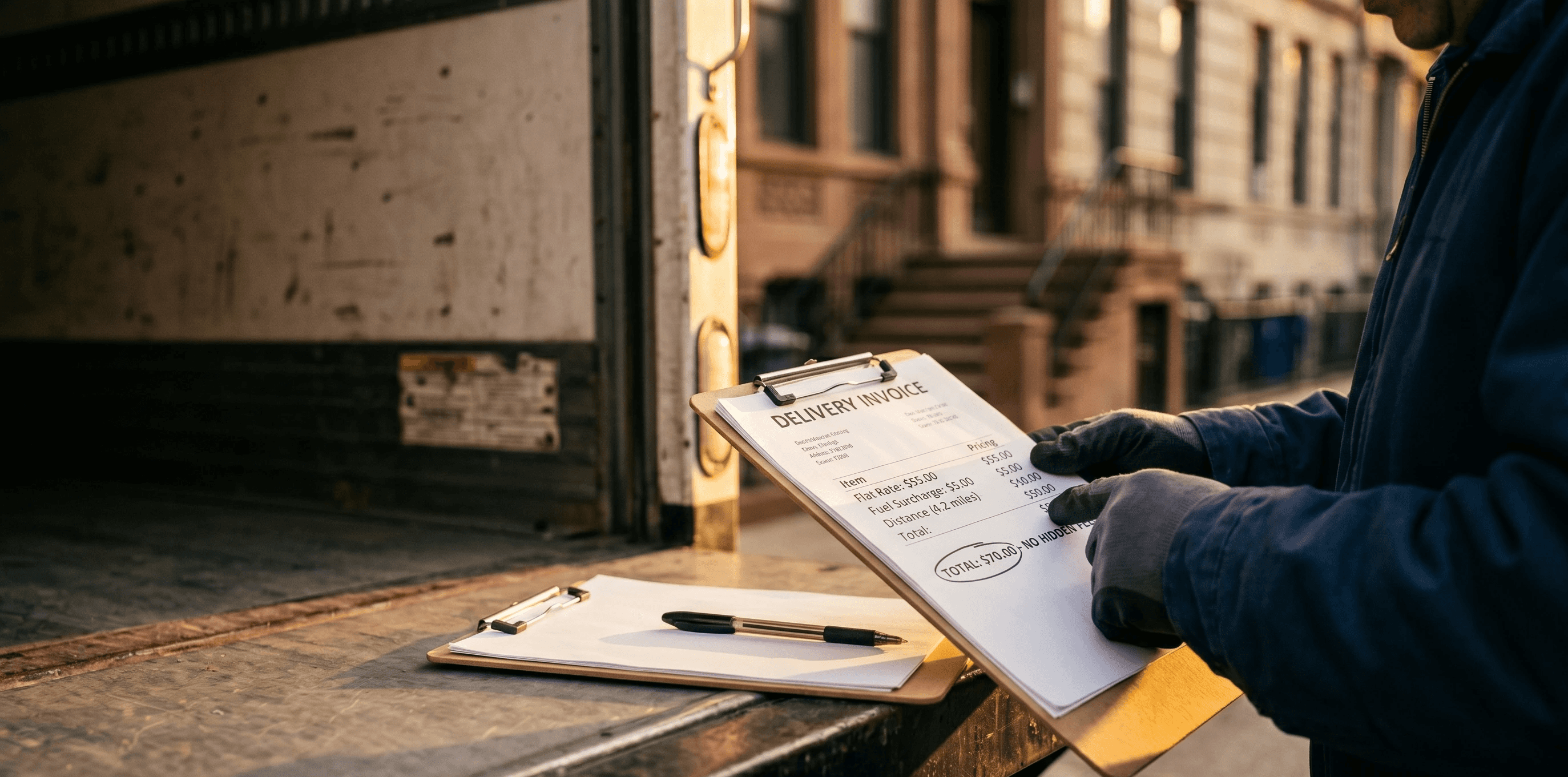 Our real pricing: $125 minimum per dispatch, $3 per mile after the minimum tier, quoted before dispatch and locked at booking. No surge pricing. No driver-acceptance lottery. No surprise stair fees, COI fees, freight elevator fees, or weekend surcharges. Vehicle, distance, and access constraints determine the final number, all transparent at booking. Single envelope intra-borough hits the $125 minimum. Cross-borough adds mileage. Cross-Hudson to Jersey City or Hoboken adds $50-200 for tunnel/bridge time. Pallet delivery with liftgate runs $300-550. Pricing calculator at our pricing calculator. Coverage across NYC courier service and NJ courier hub. Cross-state via NY-to-NJ, NY-to-Philadelphia, NY-to-Boston, NY-to-DC, NY-to-Baltimore, and Brooklyn-to-Lakewood.